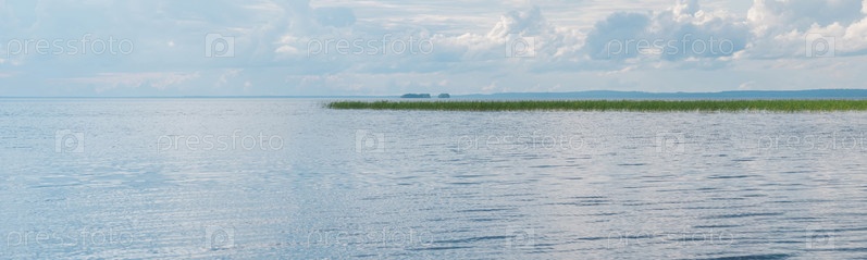 Природный ландшафт, широкое озеро с тростниковыми берегами и отдаленная береговая линия