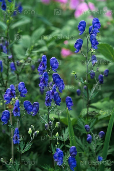 Синие цветы аконита крупным планом на размытом естественном фоне
