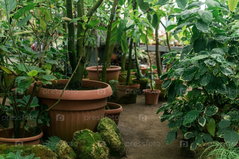 Тропические растения в горшках в большой старинной теплице