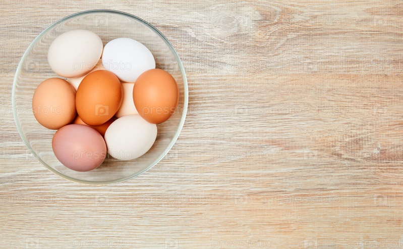 Яйца разного цвета от белого до коричневого в стеклянной миске на поверхности деревянного стола
