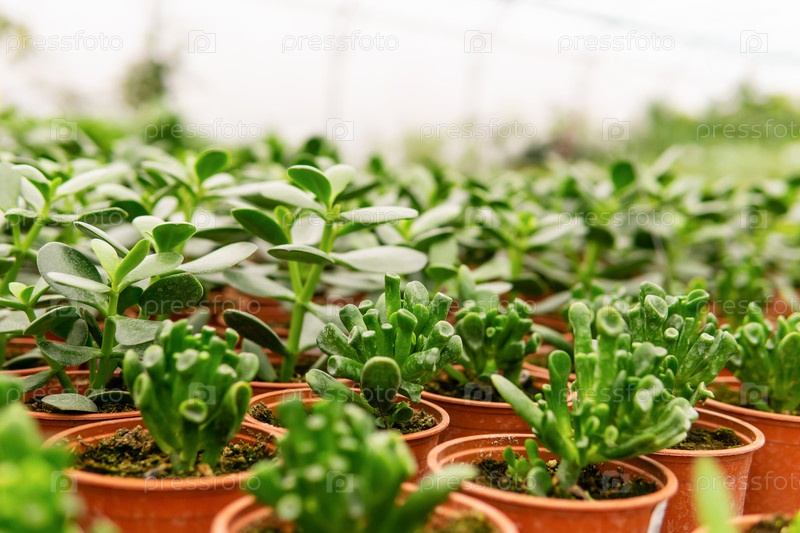 Много горшков с сочной крассулой хоббитского сорта и простой крассулой овата в теплице