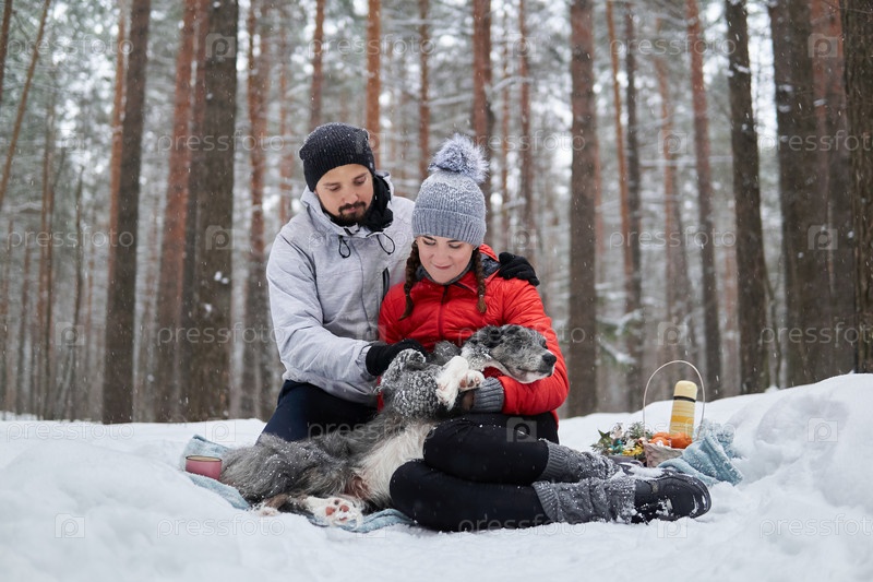 Молодая пара с собакой устраивают пикник в заснеженном лесу