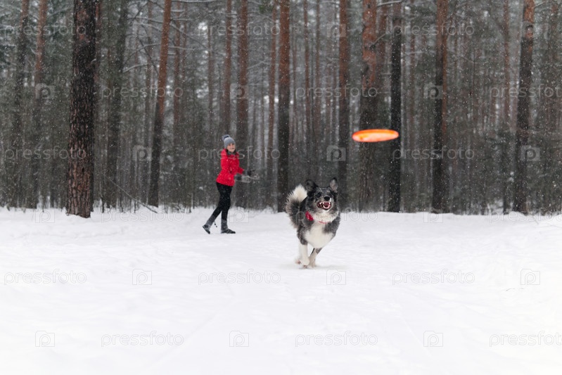 Женщина играет с собакой в зимнем лесу во время снегопада