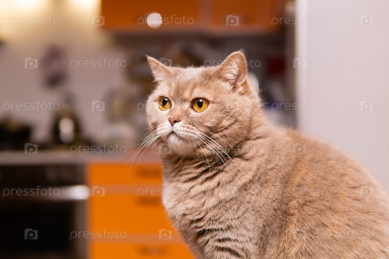 Шотландская прямоухая кошка крупным планом на фоне размытого интерьера