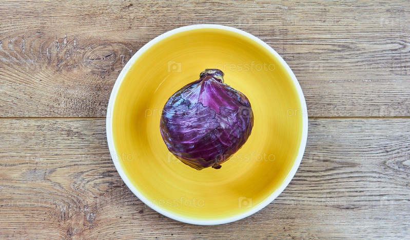 Фиолетовый кочан красной капусты на желтой тарелке на сервировочном коврике из тростника