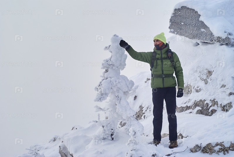 Турист с рацией смотрит вдаль, стоя на вершине горы во время метели