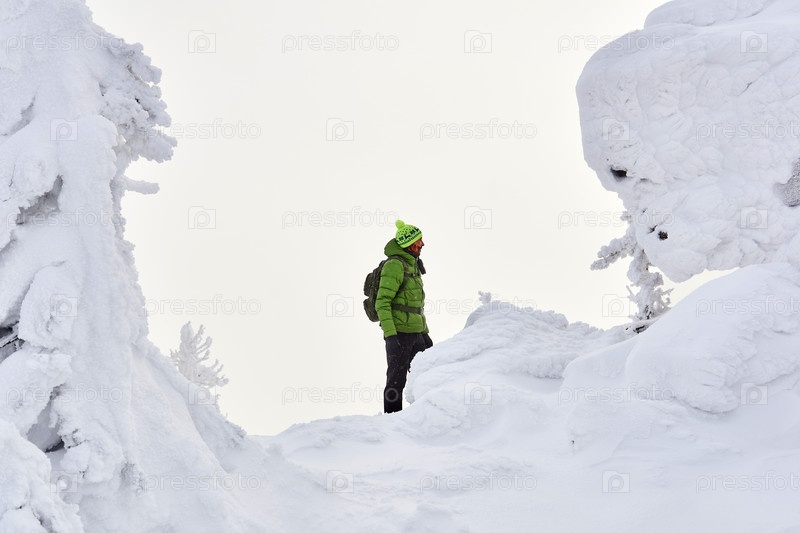 Мужчина-путешественник в зимних горах во время метели