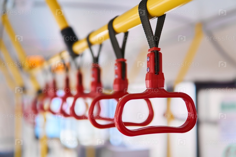 Элементы интерьера общественного транспорта - поручни городского автобуса - на размытом фоне