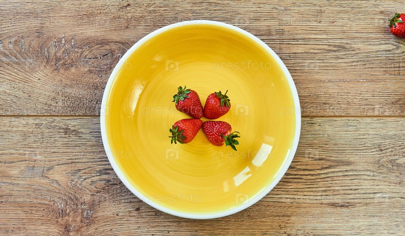 Четыре клубники на желтой тарелке на деревянном столе