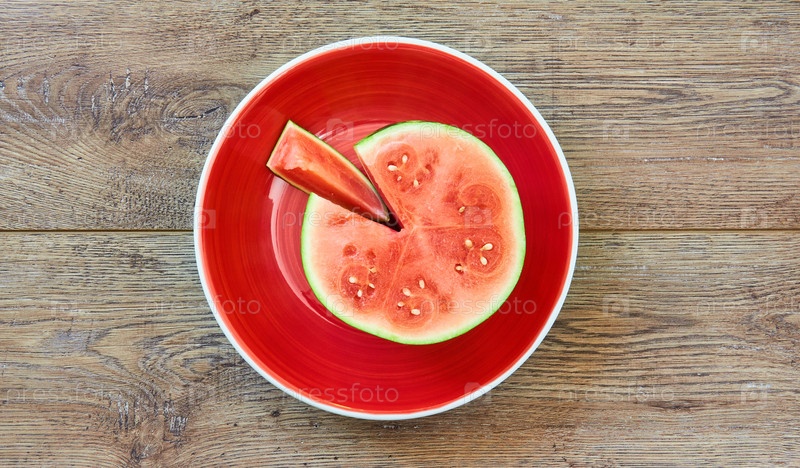 Маленький спелый разрезанный арбуз на красной тарелке на деревянном столе