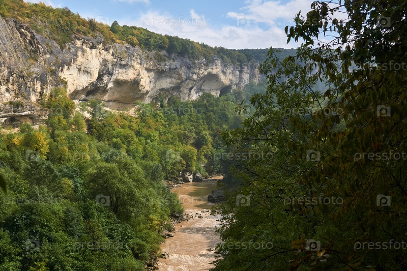 Ущелье с мутной рекой среди дикой растительности