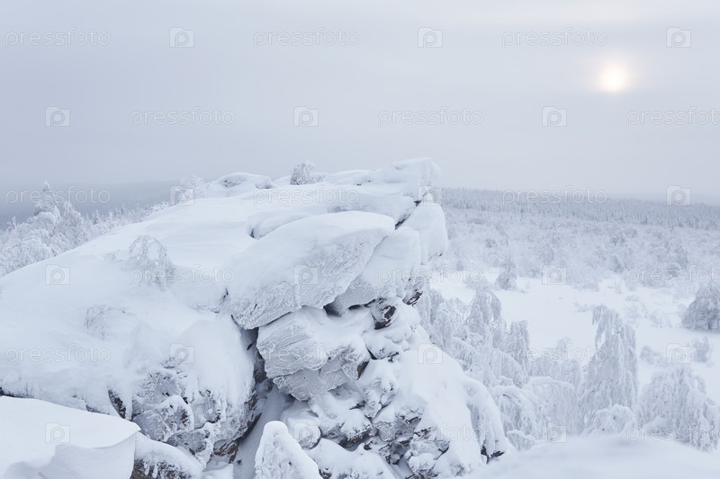 Зимний вид со скалистого горного хребта на заснеженные лесистые холмы в морозном тумане