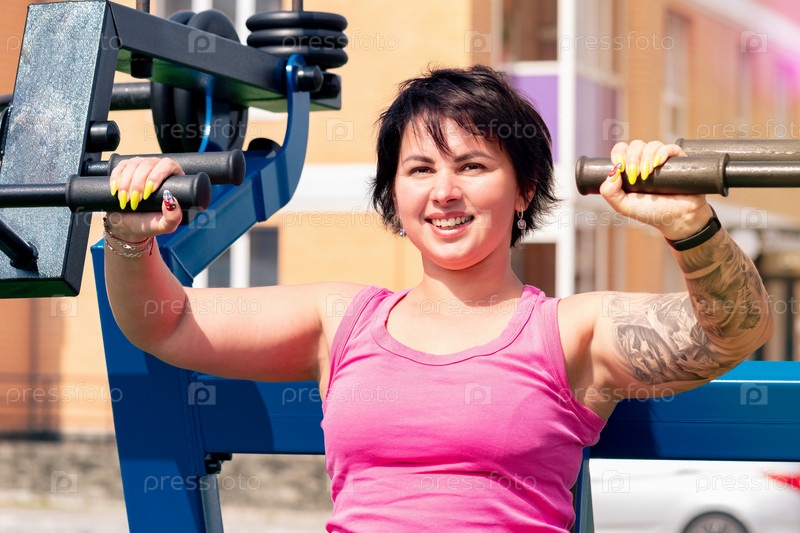 Молодая женщина выполняет упражнения на открытом воздухе, используя уличный тренажер для жима груди