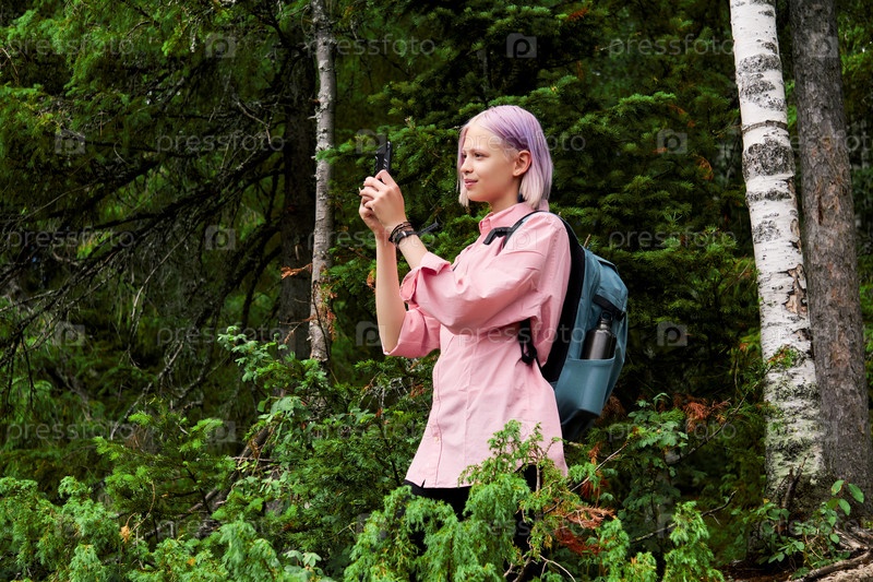 Девочка-подросток, путешествующая по лесу, фотографирует на смартфон