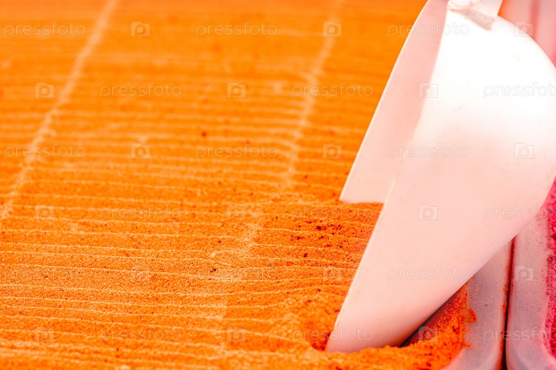 Ярко-оранжевый порошок - растворимый фруктовый чай на прилавке местного рынка крупным планом