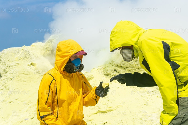 Ученые-вулканологи на склоне вулкана обсуждают собранный образец минерала на фоне дымящихся серных фумарол