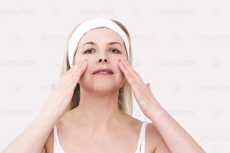 Женщина средних лет делает себе массаж лица, трогает кожу пальцами, портрет крупным планом