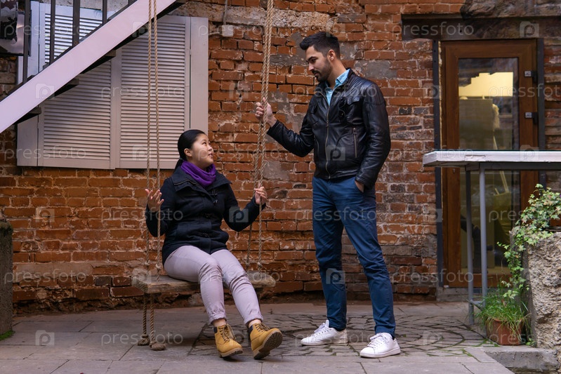 Молодой человек разговаривает с девушкой, сидящей на качелях