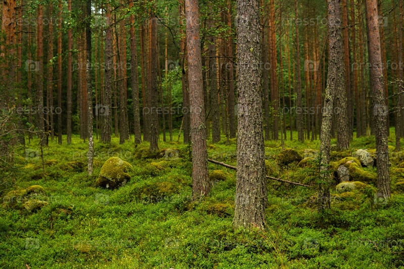 Природный ландшафт, сосновый бореальный лес с моховым подлеском, хвойная тайга с мшистыми скалами