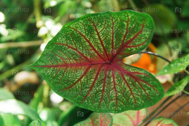 Красивый цветной лист растения каладиума крупным планом