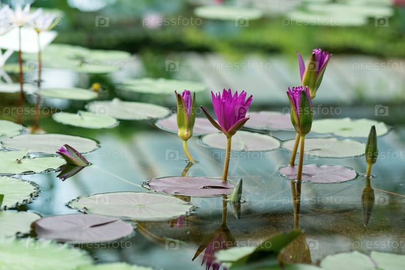 Экзотические фиолетовые кувшинки цветут в воде крупным планом