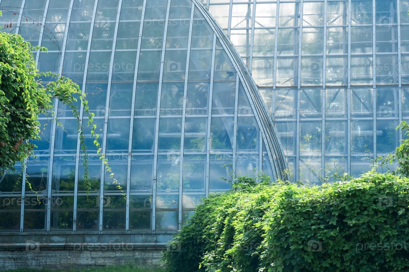 Вид на стеклянную стену большой старинной пальмовой теплицы за деревьями на открытом воздухе