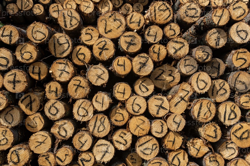 Торцы срубленных деревьев на вырубке с рукописным диаметром на каждом