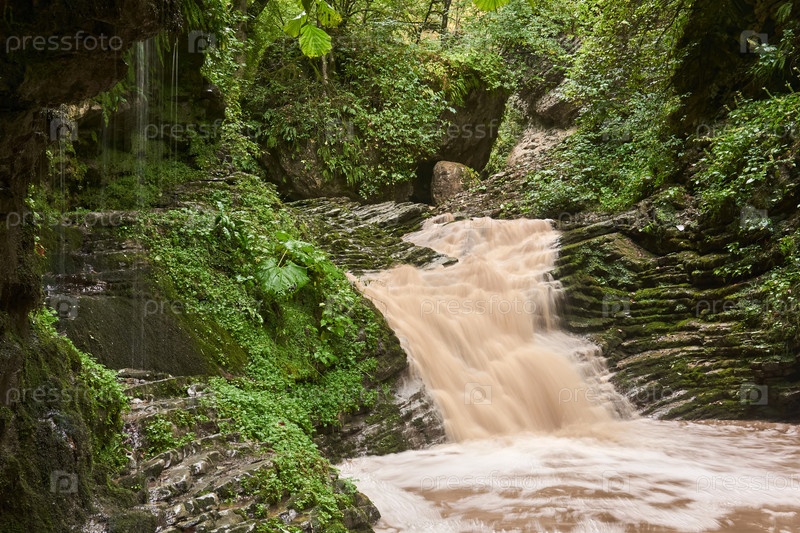 Небольшой водопад в ущелье в тропическом лесу после дождя