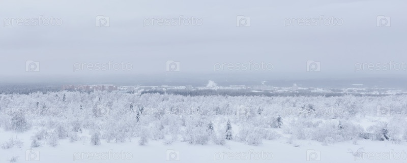 Морозная зимняя панорама - далекий город в долине посреди заснеженных лесов в морозной дымке