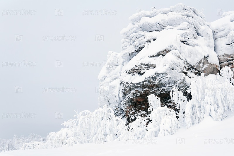 Замерзшая скала и деревья с покрытыми инеем ветвями на горном перевале после метели