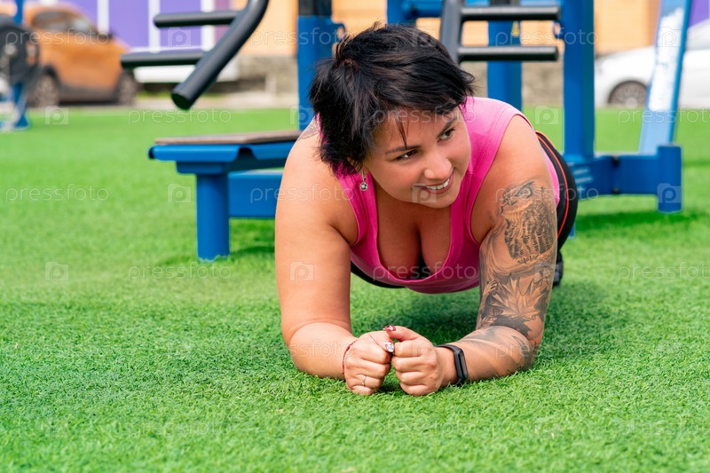 Мускулистая пухлая женщина тренируется на спортивной площадке
