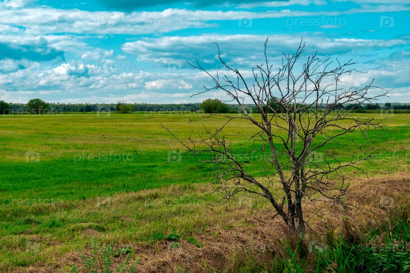 Сельский пейзаж, мертвое дерево на краю скошенного луга