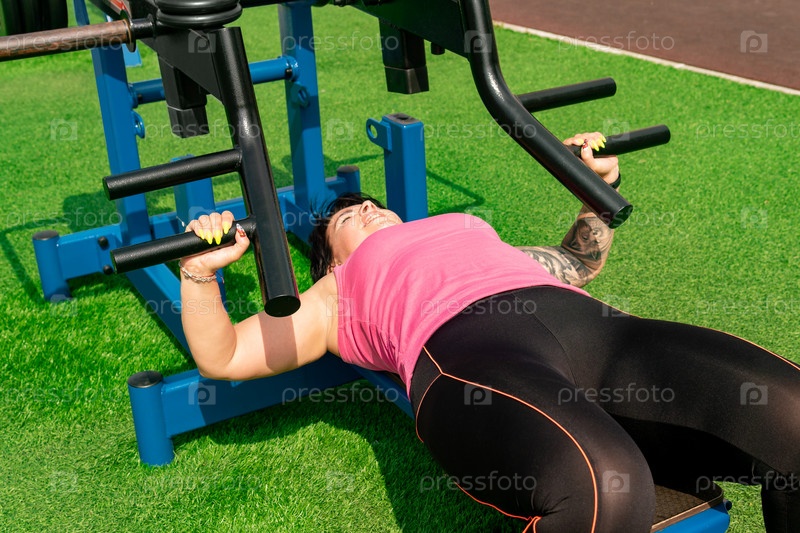 Молодая женщина выполняет упражнения на уличном тренажере для жима лежа во дворе города