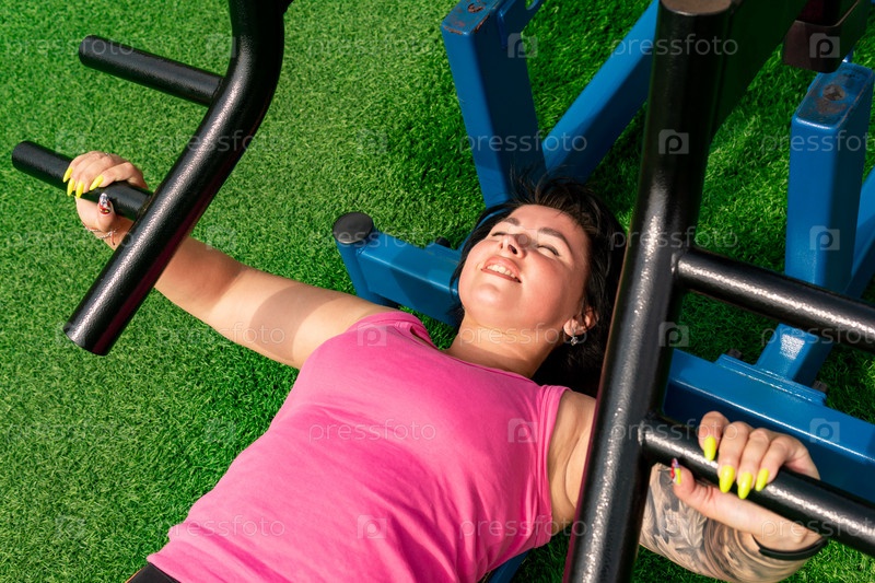 Молодая женщина выполняет упражнения на открытом воздухе, используя уличный тренажер для жима лежа