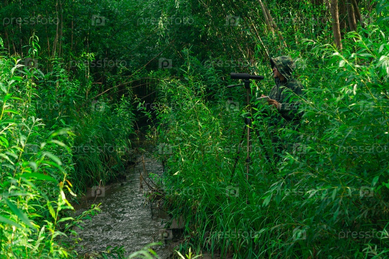 Мужчина-орнитолог проводит полевое наблюдение с помощью зрительной трубы среди зарослей в речной долине