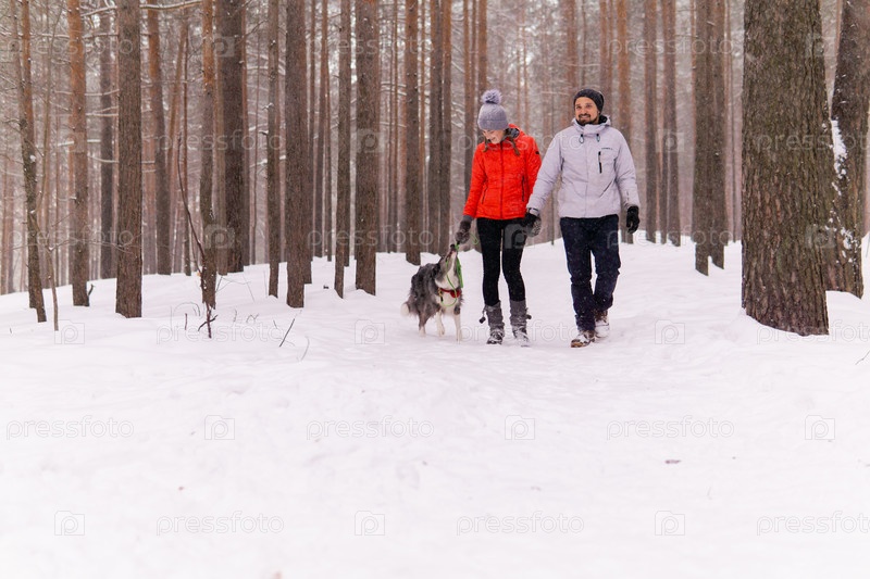 Молодая пара выгуливает собаку в зимнем лесу, собака хочет поиграть