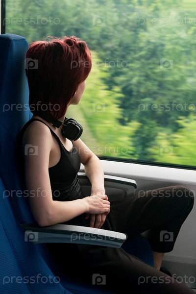 Молодая женщина в движущемся пригородном поезде смотрит в окно