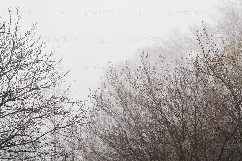 Безлистные ветки деревьев едва заметны в тумане ранней весной