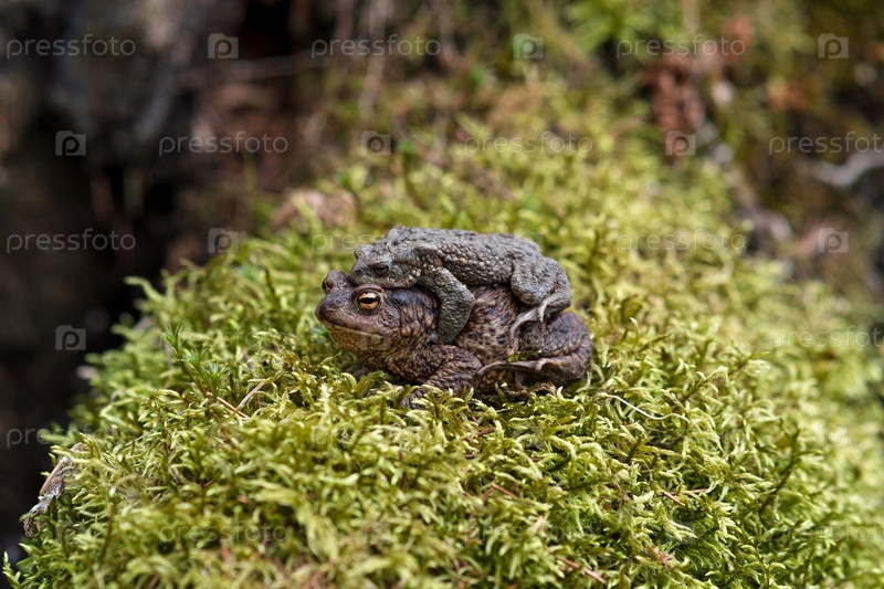 Пара обыкновенных жаб в амплексусе среди мха