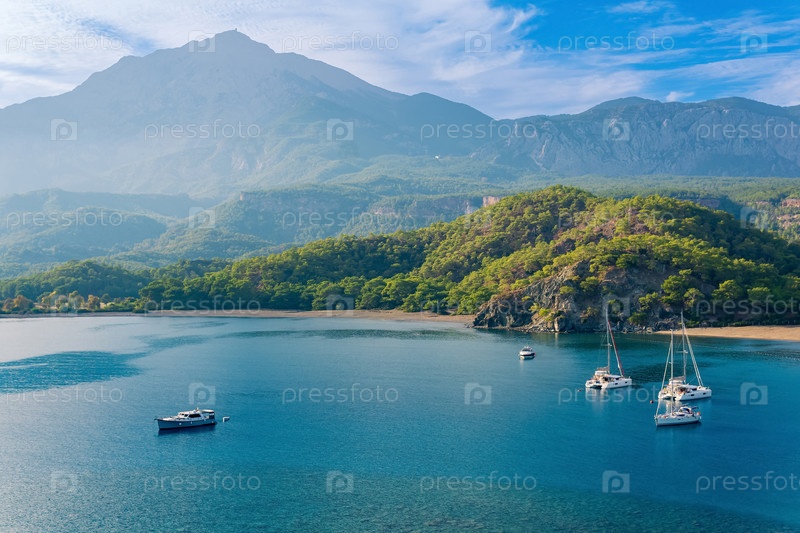 Морской залив среди гор с яхтами, вид на Южную гавань древнего города Фазелис, Турция