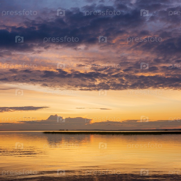 Природный ландшафт с красивым закатом над широким северным озером