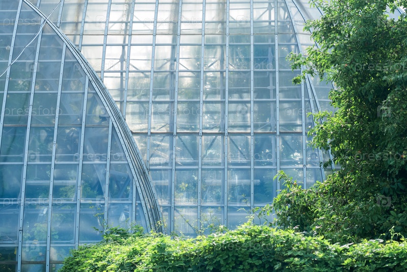 Вид на стеклянную стену большой старинной пальмовой теплицы за деревьями на открытом воздухе