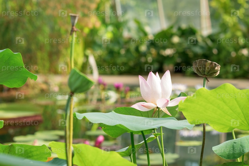 Бледно-розовый цветок и плоды лотоса в пруду при солнечном свете