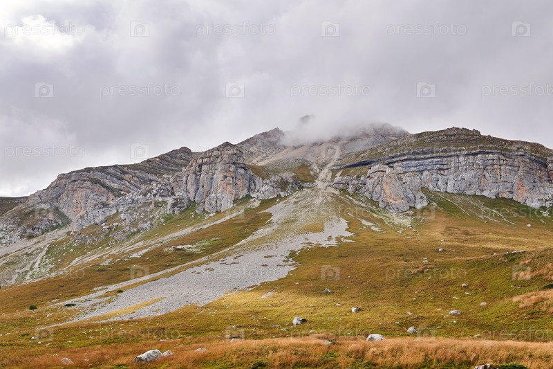 Красивый осенний горный пейзаж со скалистым пиком в облаках