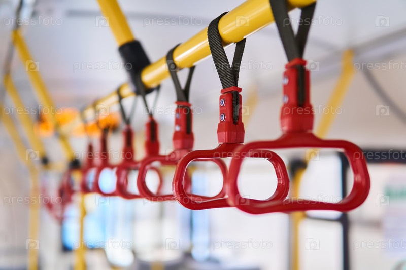 Поручни в пассажирском салоне автобуса на размытом фоне