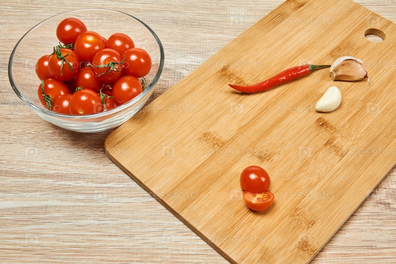 Натюрморт с помидорами черри, перцем чили и чесноком