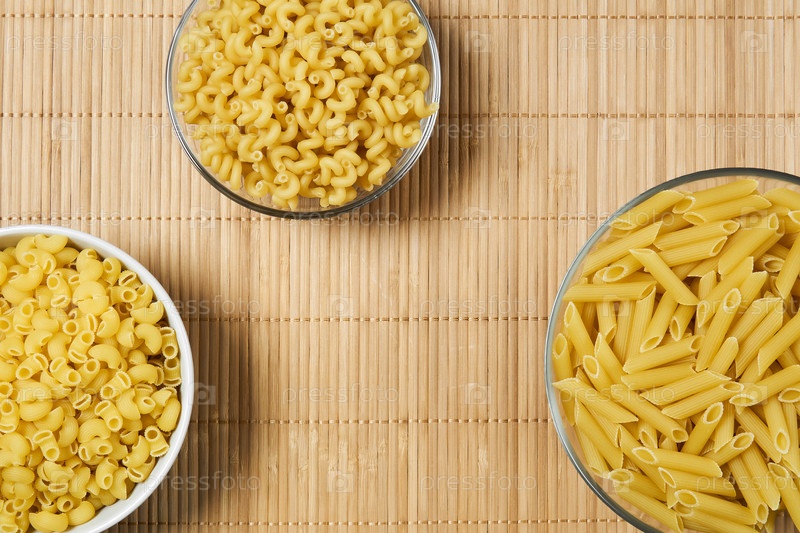 Три миски сушеных макарон на тростниковой скатерти