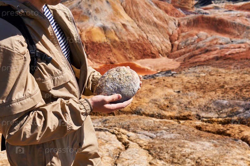 Палеонтолог держит в руках яйцо динозавра на фоне пустыни, крупный план