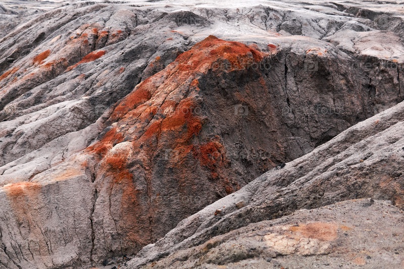 Серая выветрелая пустыня с оврагами и выходами минералов красной глины