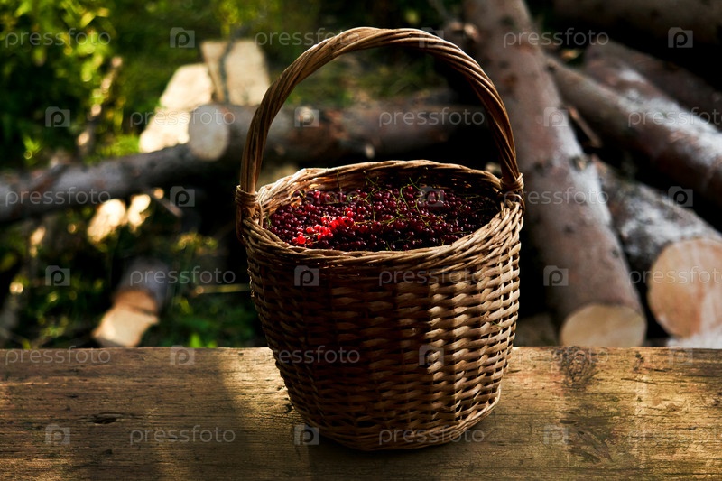 Плетеная корзина с ягодами красной смородины на деревенском фоне